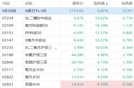 在港股A股ETF资产大涨!其中,XL博时中创业 $07234.HK 涨超19%,南方科创板50 $03109.HK 涨超14%,科创50 $03151.HK 涨超13%,南方中创业 $03147.HK 、南方沪深三百3倍做多 $07233.HK 涨超10%,华夏沪深三百 $03188.HK 、易方达A50 $03111.HK 涨超4%。