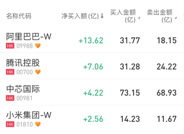 阿里巴巴-W、腾讯控股、中芯国际分别获分别获南下资金净买入13.62亿港元、7.06亿港元、4.22亿港元;盈富基金、恒生中国企业、中国海洋石油分别遭净卖出53.72亿港元、19.94亿港元、4.79亿港元。