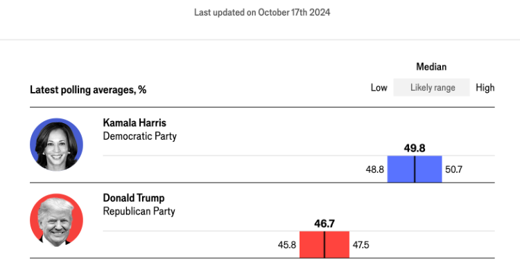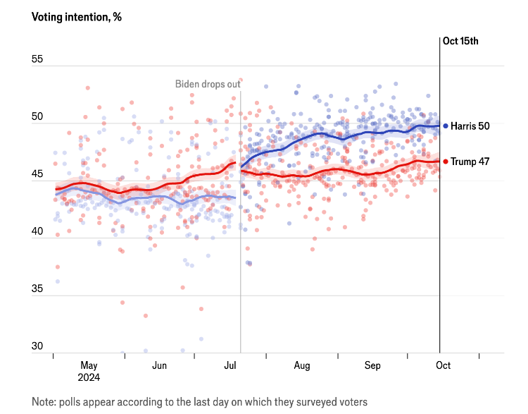 图:从普选口径来看,特朗普和哈里斯之间支持率进入10月以来,并没有出现太大的波动,哈里斯反而扩大了所谓的“领先”优势