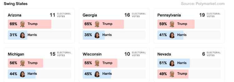图:在六个关键“摇摆州”中,特朗普在最关键的三个州中,占据绝对领先优势,剩下的短短一个月里面,哈里斯恐怕已经无力回天