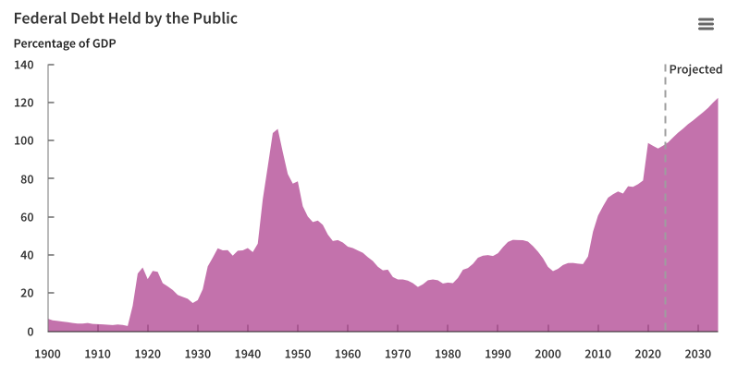 2023年美债收益率和金价关系出现异常,正值美国债务上限问题。当时根据无党派的“中立”国会预算办公室极其保守的预测趋势线,到本世纪中叶,也就是30年后,联邦债务将大约翻倍,达到国民生产总值的近250%实际上到达时间可能更早,换言之未来10年内就必须为美债不可持续问题找到答案一一如果现在已经预期到不久就会有问题,到时候再说就晚了,市场总是向前看、生活在预期之中的。