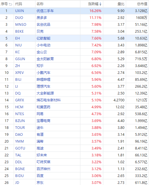 华盛资讯10月18日消息,美股早盘,中概股集体上攻,截至发稿,房多多涨超11%,名创优品、贝壳、金山云涨超7%,小鹏汽车涨超6%,哔哩哔哩、理想汽车涨超5%,网易涨超4%,百度、京东等涨超3%。