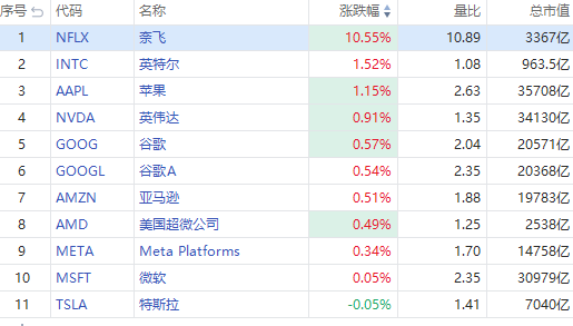 华盛资讯10月18日消息,美股盘中,明星科技股普涨,截至发稿,奈飞涨超10%,英特尔、苹果涨超1%,英伟达、谷歌、亚马逊等跟涨。