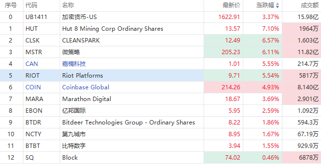 加密货币概念股走强,HUT $HUT 涨超7%,CLEANSPARK、微策略涨超6%,嘉楠科技、RIOT $RIOT 涨超5%,Coinbase $COIN 涨近5%。