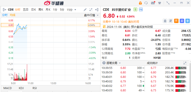 黄金股集体上扬,美国黄金公司涨超5%,科尔黛伦矿业涨超4%,巴里克黄金涨超2%。现货黄金价格涨约1%,刷新盘中历史高位至2719.11美元/盎司。