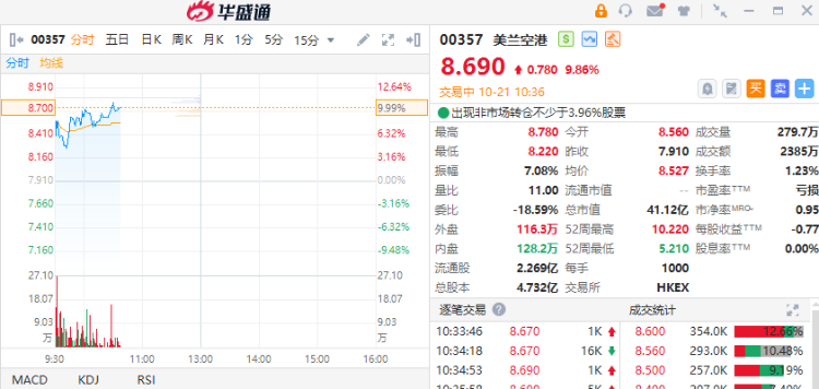 10月21日, 美兰空港(00357) 早盘高开,截至发稿,涨9.86%,报8.69港元,成交额2385万港元。