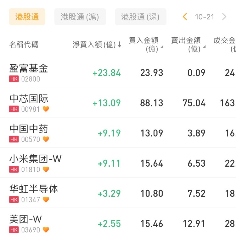 盈富基金、中芯国际、中国中药分别获分别获南下资金净买入23.84亿港元、13.09亿港元、9.19亿港元;中国移动、阿里巴巴-W、中国海洋石油分别遭净卖出3.58亿港元、1.44亿港元、1亿港元。