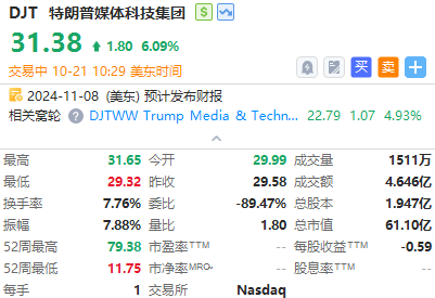 特朗普媒体科技集团 $DJT 涨超6%,现在距离美国大选只剩下15天,美国前总统特朗普前往摇摆州宾夕法尼亚州的一家麦当劳餐厅“打工”,为大选造势。此外,高盛、摩根大通、德银等集体发声,“聪明钱”开始all in特朗普胜选。