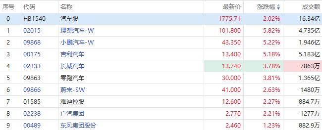 汽车股早盘普涨,截至发稿,小鹏汽车-W、理想汽车-W、吉利汽车涨超5%,长城汽车、零跑汽车涨近4%,蔚来-SW、广汽集团等涨超2%。