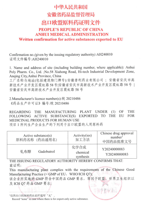 本次钆布醇WC证书的获得,表明该企业所实施的GMP符合中国药品GMP要求,等同于欧盟、世界卫生组织以及ICH Q7药品GMP 要求。