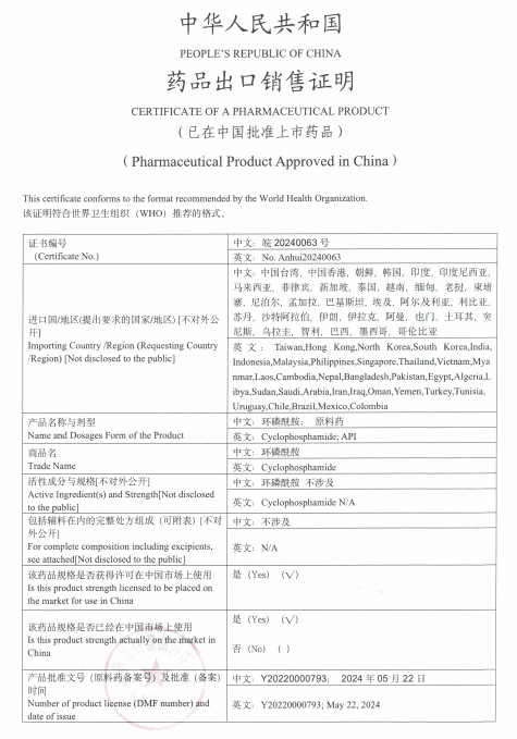 同时环磷酰胺COPP证书的获得,表明该产品符合出口销售的要求,两个证书的获得都对推动产品海外市场推广和出口贸易带来积极影响。