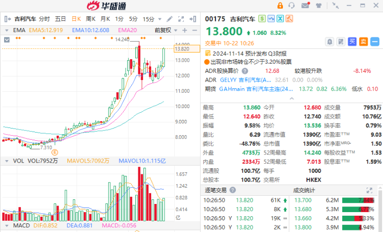 吉利汽车(00175)早盘持续走高,股价大涨8.16%,现报13.78港元,成交额9.75亿港元。
