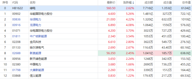 华盛资讯10月22日消息,港股早盘高开震荡,绿电股集体走高,截至发稿,华能国际电力股份、华润电力、龙源电力均涨超4%,中广核新能源、华电国际电力股份涨超3%,金风科技涨超2%。
