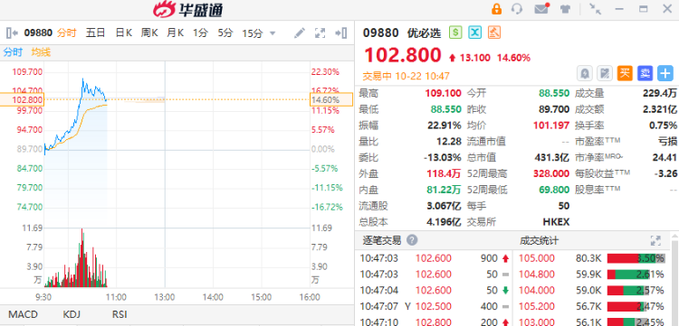 10月22日,优必选(09880)早盘大涨,截至发稿,涨14.60%,报102.8港元,成交额2.321亿港元。