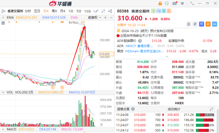 港交所将于本周三(23日)公布今年第三季业绩,受惠港股近月日均成交额增加,7月至9月每日成交金额为986亿、995亿及1,692亿元,港交所股价一度升至397.8港元/股,9月涨幅超38%。