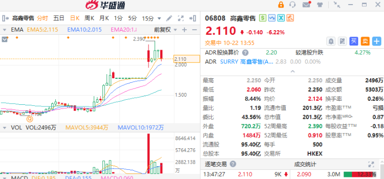 高鑫零售(06808)临近午盘受压走低,截至发稿,仍跌5.33%,报2.13港元,成交额5262.02万港元。