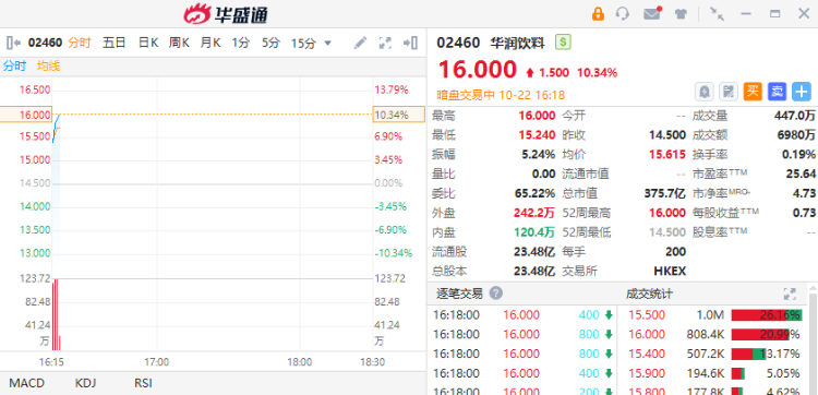 华盛资讯10月22日讯,港股华润饮料正在暗盘交易中,截至发稿涨10.34%,报16港元/股,中签一手账面浮盈300港元,最新总市值超375亿港元。该股预计将于10月23日正式挂牌上市,配售结果将于今日晚间披露。