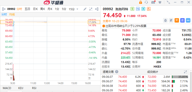 华盛资讯10月23日消息,港股盘初,泡泡玛特股价走强,截至发稿,涨17.34%,报74.45港元,成交额5.335亿港元。