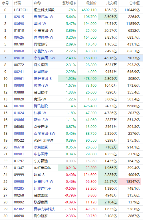 科网股集体大涨!美团-W大涨逾5%,小米集团-W涨近4%,哔哩哔哩-W涨超3%,京东集团-SW涨超2%。