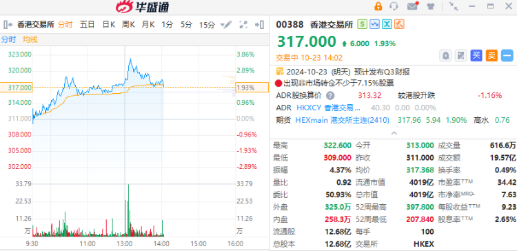 10月23日讯,港交所(00388)午后一度涨近4,截至发稿,涨1.93%,报317港元,成交额19亿港元。
