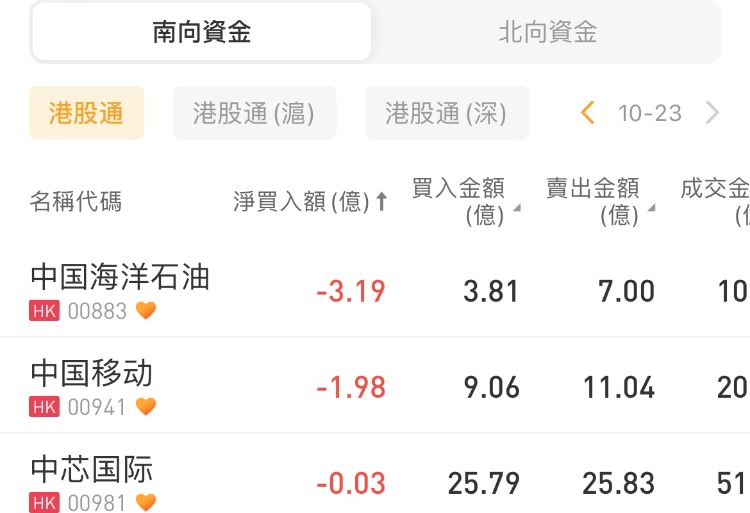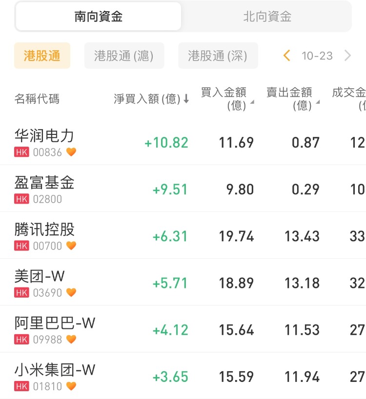 华润电力、盈富基金、腾讯控股分别获分别获南下资金净买入10.82亿港元、9.51亿港元、6.31亿港元;中国海洋石油、中国移动分别遭净卖出3.19亿港元、1.98亿港元。