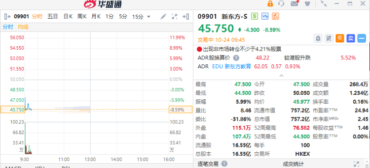 华盛资讯10月24日消息,新东方-S绩后重挫,隔夜美股跌超8%。截至发稿,跌8.59%,报45.75港元,成交额1.234亿港元。
