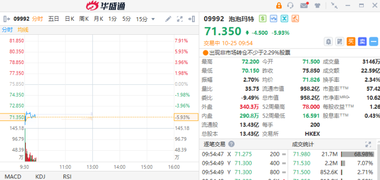 华盛资讯10月25日消息,港股早盘,泡泡玛特股价走弱,盘初一度下跌7.5%,为三个月来盘中最大跌幅。截至发稿,泡泡玛特跌近6%,报71.35港元,成交额22.59亿港元。