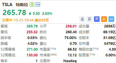 华盛资讯10月25日消息,特斯拉盘初直线拉升,现涨超2%,站上265美元。美银将特斯拉的目标价从255美元上调至265美元。