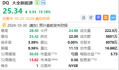 华盛资讯10月25日消息,热门中概股集体走高,大全新能源涨超15%,叮咚买菜涨超12%,微博、哔哩哔哩涨超5%,阿里巴巴、拼多多涨超2%。