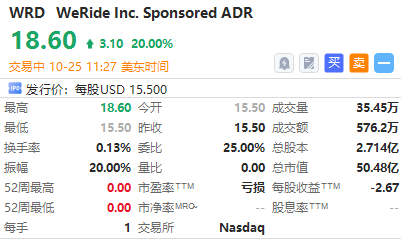 全球自动驾驶领军企业文远知行( $WRD .US)美东时间10月25日正式在纳斯达克证券交易所挂牌上市,成为全球通用自动驾驶公司第一股,也是全球Robotaxi第一股。截至发稿,文远知行大涨20%。