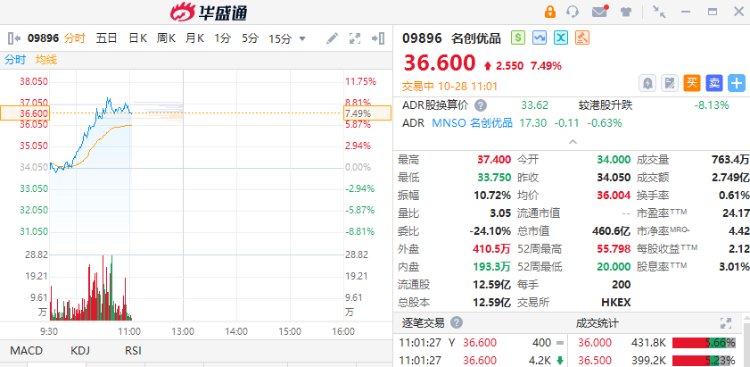 10月28日,名创优品(09896)股价走强,截至发稿,涨7.49%,报36.6港元,成交额2.749亿港元。