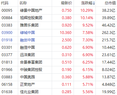 华盛资讯10月28日讯,港股内房股午后集体上扬,截至发稿,绿景中国地产、旭辉控股集团涨超10%,雅居乐集团涨超9%,绿城中国、融创中国涨超7%,远洋集团涨超6%,中国奥园、佳兆业集团涨超5%。