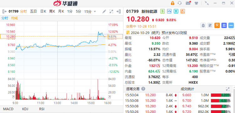 10月28日,新特能源(01799)尾盘一度急涨逾13%,截至发稿,涨9.83%,报10.28港元,成交额2.198亿港元。