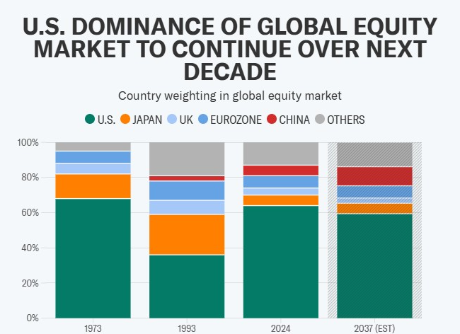 在摩根大通周一发布的《2025年长期资本市场假设》中,该团队预计,到2037年,美国公司在全球股票市场的市值份额将从目前的64%降至60%。尽管如此,美国仍将保持对全球第二大股市的巨大领先优势。