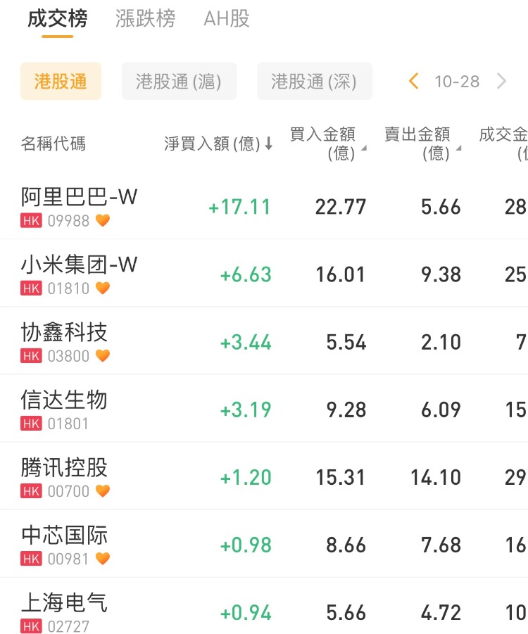 阿里巴巴-W、小米集团-W、协鑫科技分别获分别获南下资金净买入17.11亿港元、6.63亿港元、3.44亿港元;中国移动、融创中国、中国海洋石油分别遭净卖出5.83亿港元、1.92亿港元、0.91亿港元。