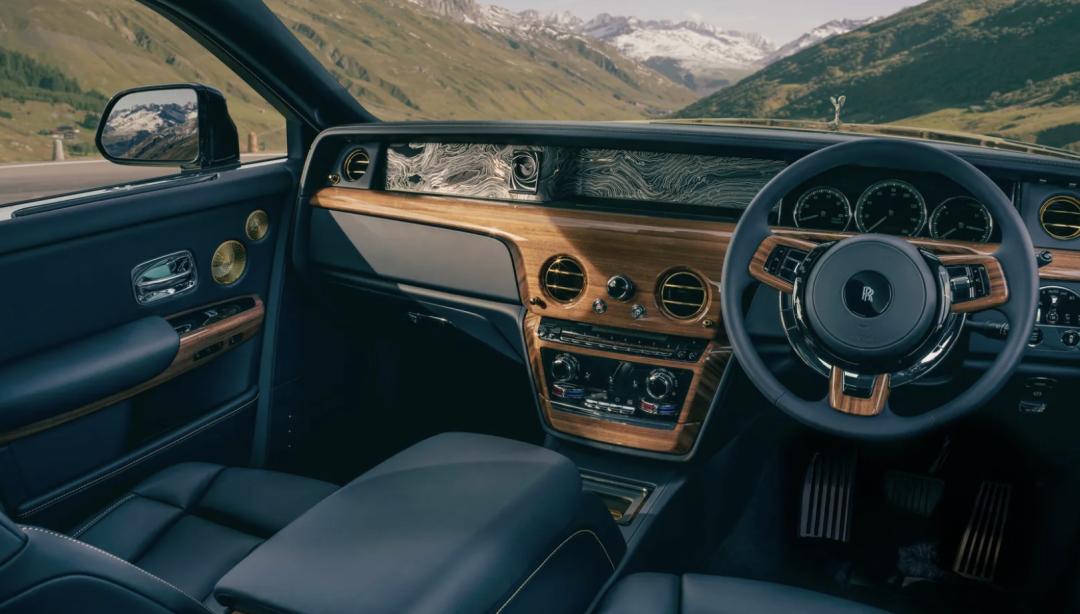 车内装饰精致非凡,劳斯莱斯在前中控台上嵌入了一个18克拉黄金打造的Phantom车形装饰条,前后中控台均饰有金色边框。手套箱上刻有电影中的经典台词「这是黄金,邦德先生。我一生都热爱它的色彩、光辉和神圣的美感」。内饰还包括海军蓝真皮座椅和胡桃木细节装饰,整体奢华典雅