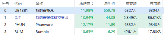 特朗普概念股高开,特朗普媒体科技集团 $DJT 上涨14%,Phunware上涨12%,Rumble上涨10%。