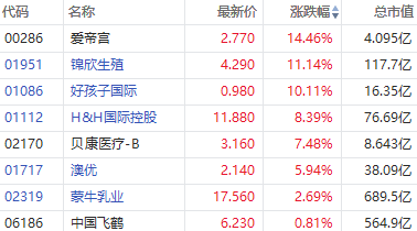 截至发稿,三胎概念股集体走强,爱帝宫涨超14%,锦欣生殖涨超11%,好孩子国际涨超10%,澳优涨近6%。