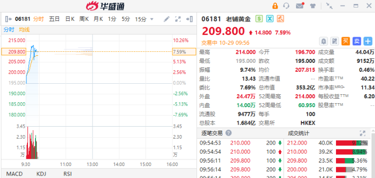 10月29日,老铺黄金(06181)一度涨超9%再创新高,截至发稿,涨7.59%,报209.8港元,成交额9152万港元。