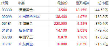 华盛资讯10月30日讯,港股黄金股逆市上扬,截至发稿,灵宝黄金大涨逾18%,中国黄金国际涨超4%,老铺黄金、招金矿业涨超2%,山东黄金跟涨。