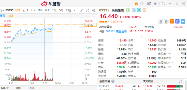 10月30日,荣昌生物(09995)逆市走高,截至发稿,涨13.85%,报16.44港元,成交额1.023亿港元。