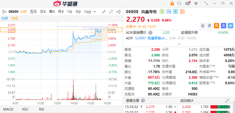 10月30日,高鑫零售(06808)午后涨超9%,截至发稿,涨9.66%,报2.27港元,成交额4089万港元。