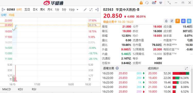 华盛资讯10月30日讯,港股华昊中天医药-B正在暗盘交易中,截至发稿涨30.31%,报20.85港元/股,中签一手赚970港元,最新总市值超76亿港元。该股预计将于10月31日正式挂牌上市,配售结果将于今日晚间披露。
