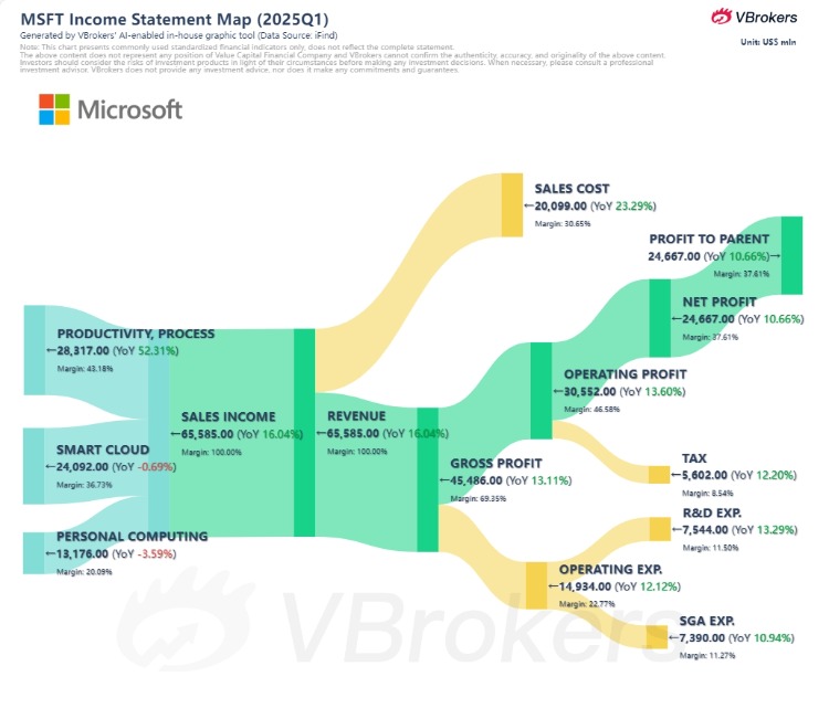 截至9月30日的季度中,微软每股收益为3.30美元,超过预期的3.10美元;营收达到655.9亿美元,高于市场预估的645.1亿美元,同比增长16%。净利润为246.7亿美元,相较去年同期的222.9亿美元显著增长。