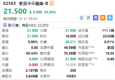 华盛资讯10月31日讯,港股华昊中天医药-B今日挂牌,截至发稿涨34.38%,报21.50港元/股,中签一手赚1100港元,最新总市值超78亿港元。该股此前公开发售获21.45倍认购,一手中签率4.45%。