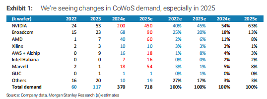 而根据大摩预计,2024年英伟达一家就占据了台积电一半以上的CoWoS产能,而AMD仅11%。并且鉴于对MI325需求的不确定性,AMD似乎削减了2025年在台积电的部分订单,而这部分产能又立即被英伟达接手。