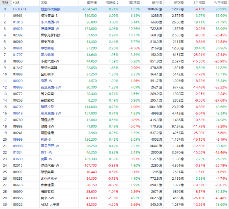 科网股走高,携程集团-S、哔哩哔哩-W涨超3%,小鹏汽车-SW、百度集团-SW涨超1%,阿里巴巴-W、快手-W、腾讯控股跟涨。