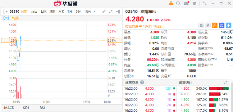 华盛资讯10月31日讯,港股德翔海运正在暗盘交易中,截至发稿涨2.39%,报4.28港元/股,中签一手赚100港元,最新总市值超70亿港元。该股预计将于11月1日正式挂牌上市,配售结果将于今日晚间披露。