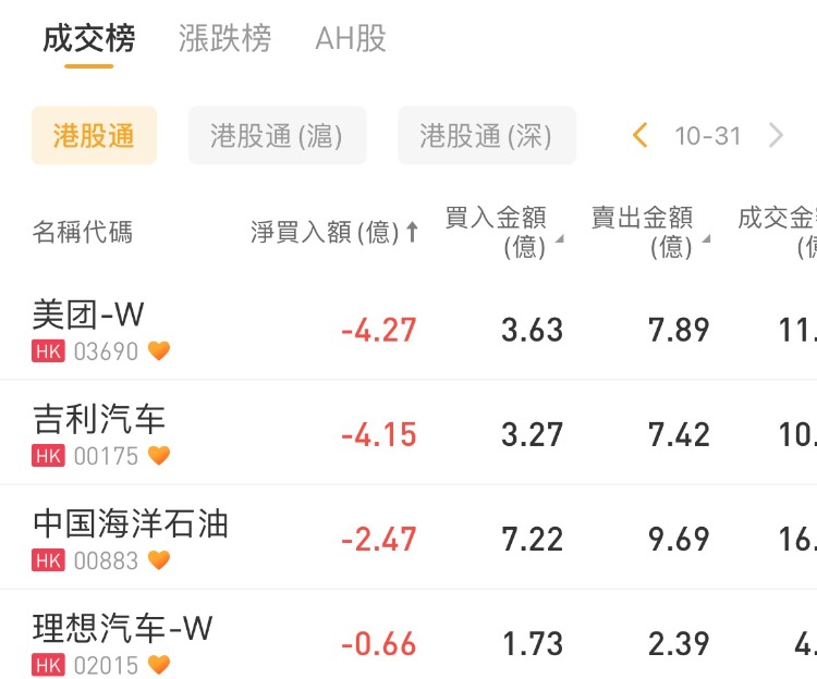 美团-W、吉利汽车、中国海洋石油分别遭净卖出4.27亿港元、4.15亿港元、2.47亿港元。