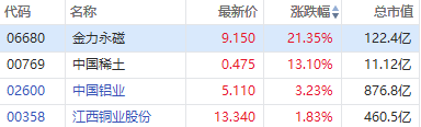 稀土概念股早盘走强,截至发稿,金力永磁涨超21%,中国稀土涨超13%,中国铝业涨超3%,江西铜业股份涨近2%。